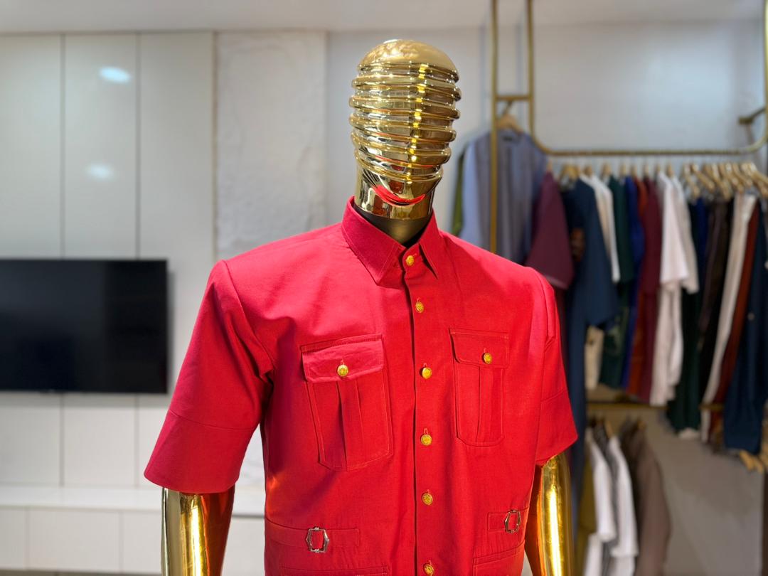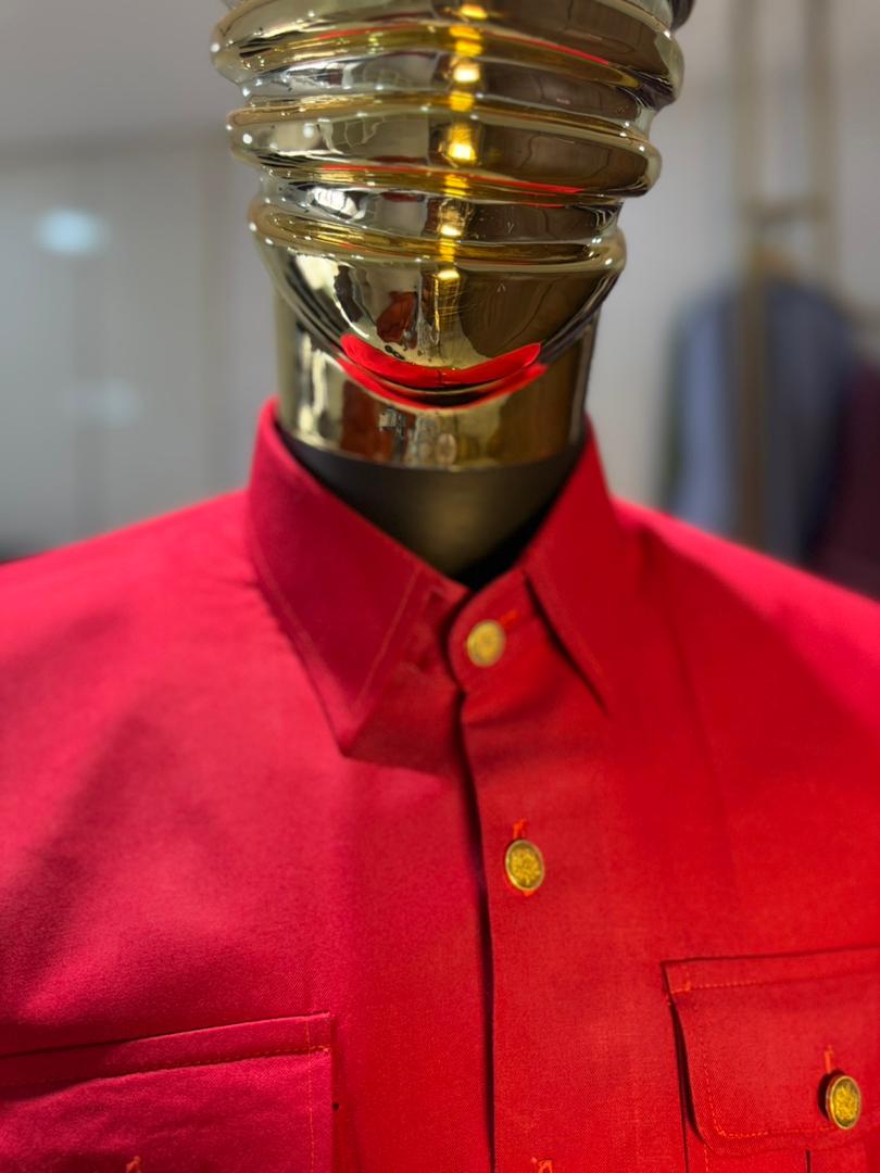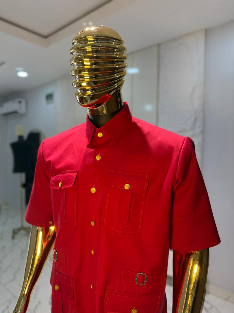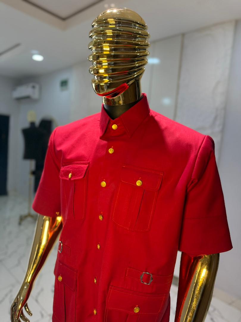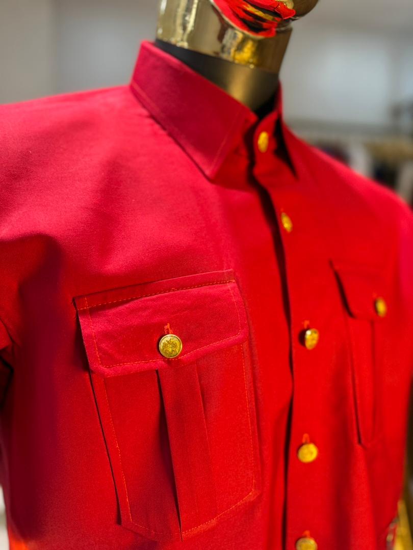 Make a powerful statement with our Crimson Safari Luxury Suit, a masterclass in bold tailoring and utilitarian elegance. This isn’t just a suit; it’s a symbol of authority and refined taste. Designed for the modern leader, this vibrant red piece blends the structured silhouette of a military-inspired safari jacket with the high-end finish of bespoke menswear.